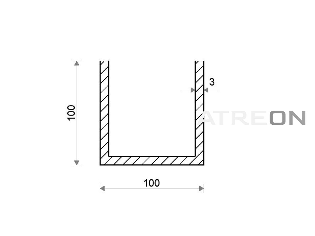 Hliníkový U profil 100x100x100x3 je otevřený hliníkový U profil slitiny EN 6060 a tvrdosti T6 se zaručenou svařitelností. Má zaoblené hrany a využití nachází především ve stavebnictví a zámečnické činnosti. Jeho hlavní výhodou je nižší hmotnost ve srovnání s jekly vyrobenými z běžné oceli. Tento hliníkový jekl s výškou 100 mm, šířkou ramene 100 mm a tloušťkou stěny 3 mm je dodáván ve standardní výrobní délce 6 m s hmotností 14,28 kg. Váha produktu na 1 m je 2,38 kg .