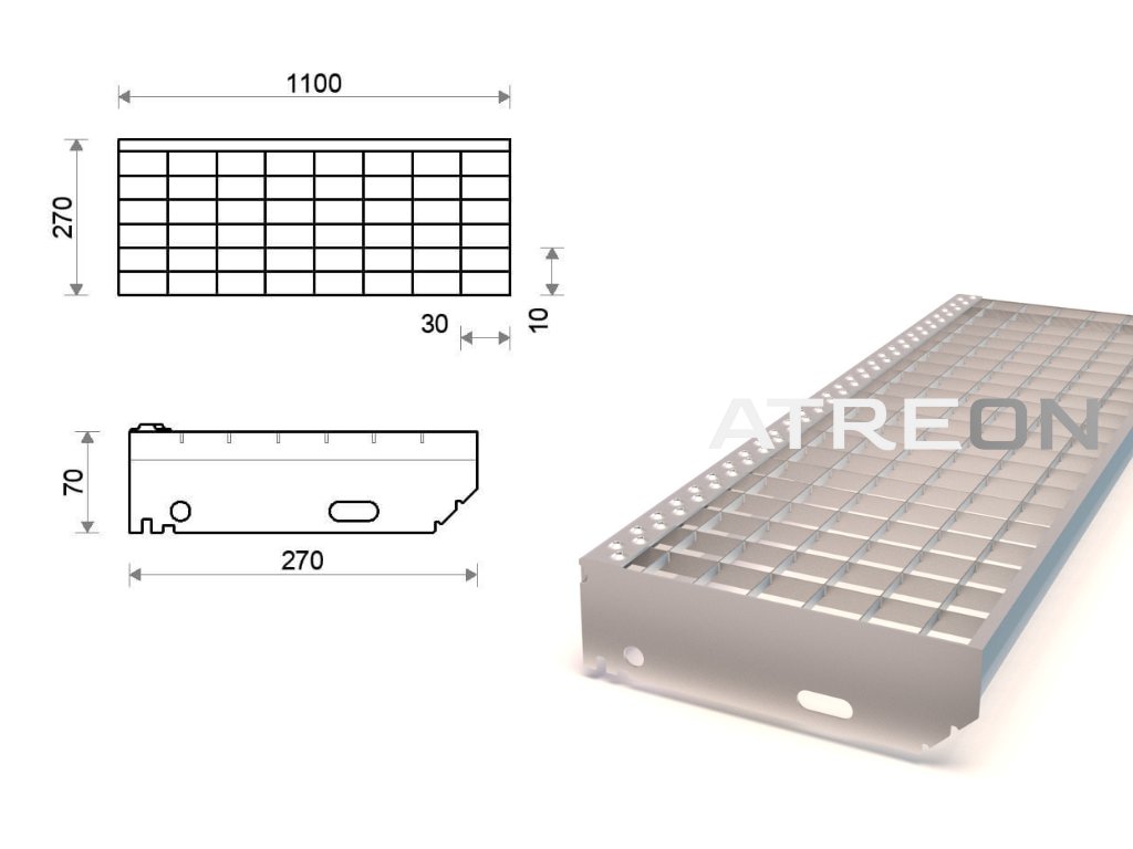 Pozinkovaný schodišťový stupeň lisovaný 1100x270 mm, oko 30x10 mm