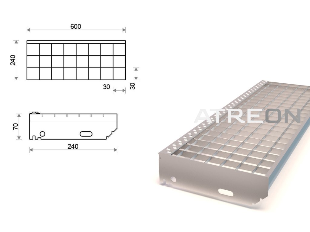Pozinkovaný schodišťový stupeň lisovaný 600x240 mm, oko 30x30 mm