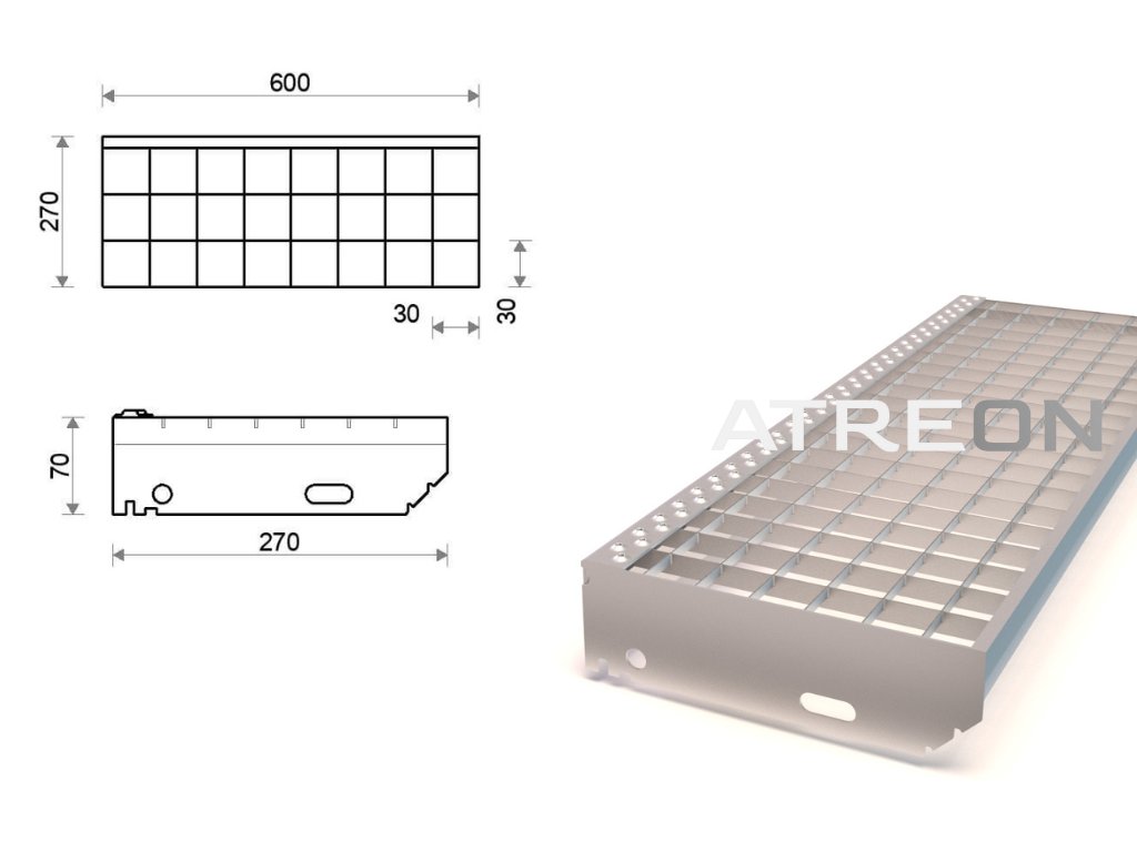 Pozinkovaný schodišťový stupeň lisovaný 600x270 mm, oko 30x30 mm