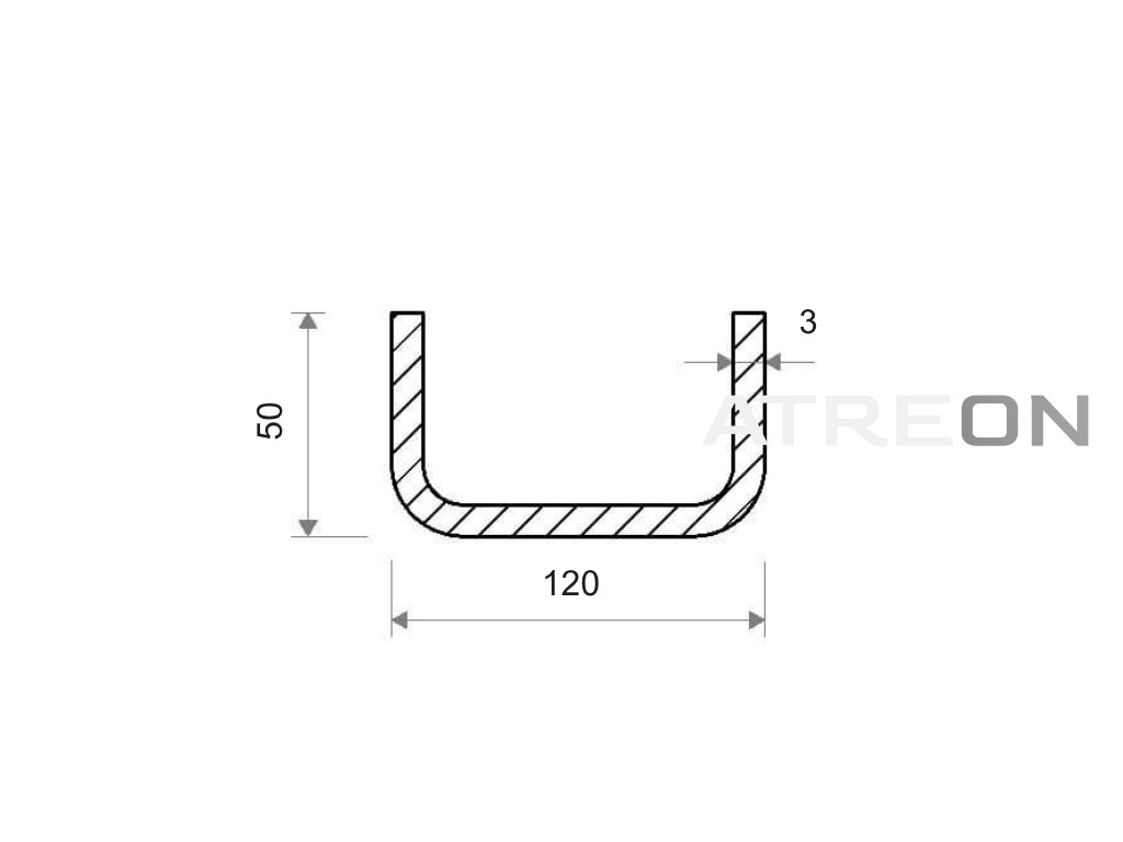 U profil 50x120x50x3 je otevřený silnostěnný nerovnostranný ocelový profil tvaru U jakosti S235 válcovaný za studena se zaručenou svařitelností. Tento obdélníkový jekl je ohýbaný se zaoblenými hranami. Využití má především ve stavebnictví a zámečnické činnosti. Dodáván ve výrobní délce 6 m s hmotností 29,22 kg, výškou 50 mm, šířkou profilu (základny) 120 mm a tloušťkou stěny 3 mm. Váha produktu na 1 m je 4,87 kg.